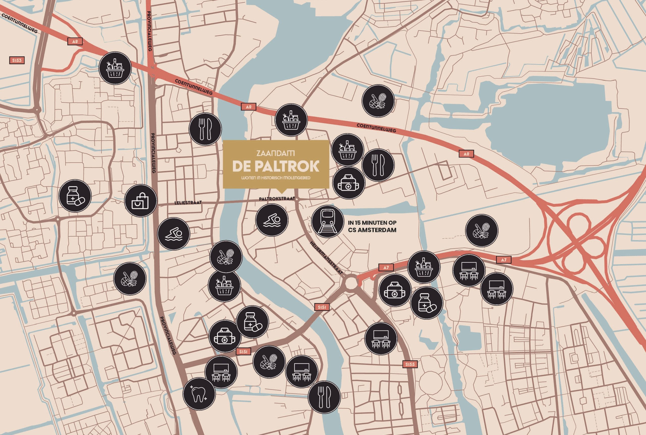Vanuit De Paltrok bereik je moeiteloos elke plek waar je wilt zijn. Op de fiets ben je in tien minuten in het centrum van de stad, met de trein – het station is vlakbij – sta je binnen een kwartier in het hart van Amsterdam. En met de A7 en A8 om de hoek, ben je zo op weg naar welke bestemming je maar wilt.