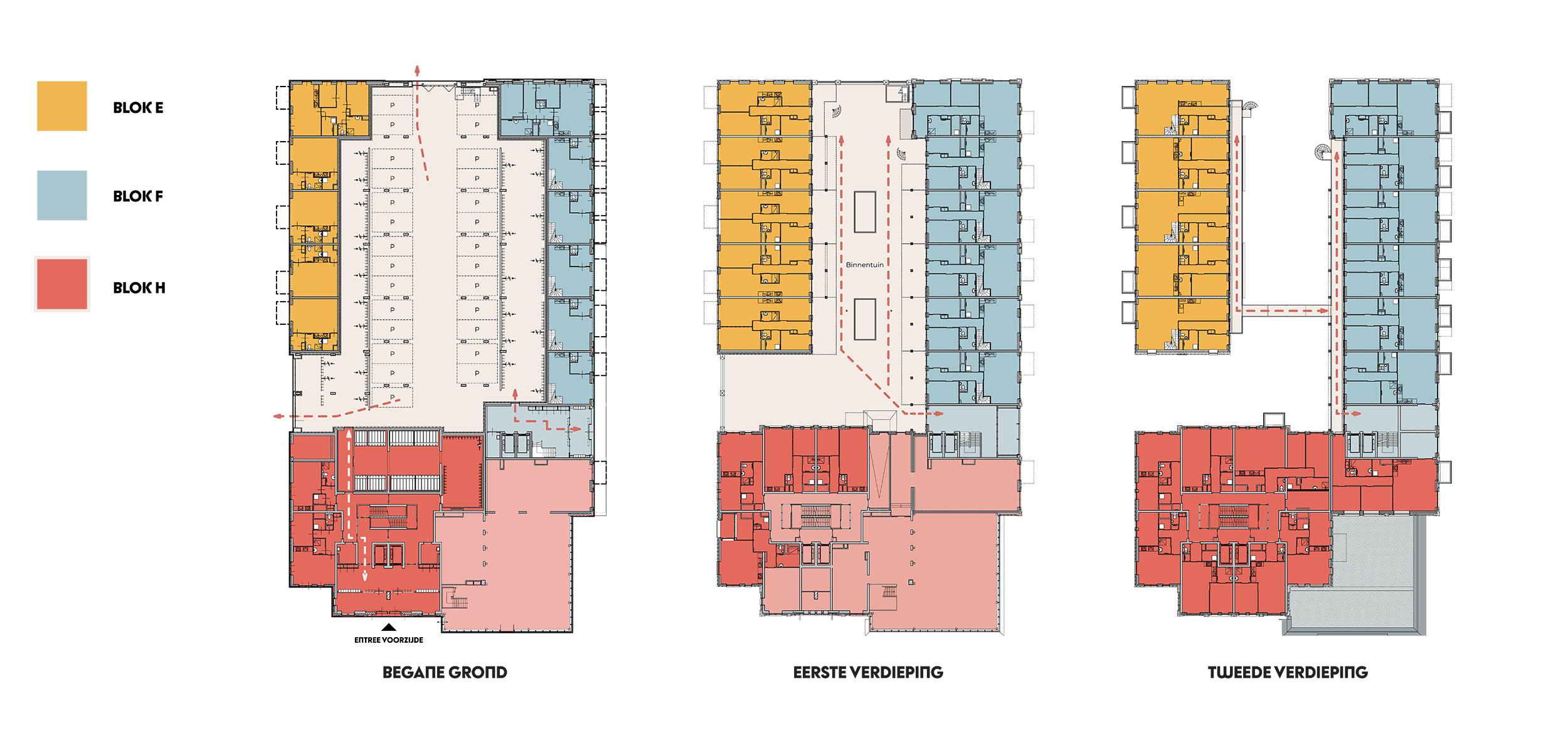 Het project De Paltrok bestaat uit drie woonblokken – Blok H, E en F – die samenkomen rondom een gezamenlijke daktuin. Onder en rondom deze daktuin bevinden zich diverse parkeerplaatsen. Om bewoners goed op weg te helpen in en om de woonblokken, zijn er drie overzichtskaarten met looproutes opgesteld: voor de begane grond, de eerste verdieping en de tweede verdieping. Bekijk de juiste kaart om snel en gemakkelijk uw route te vinden.